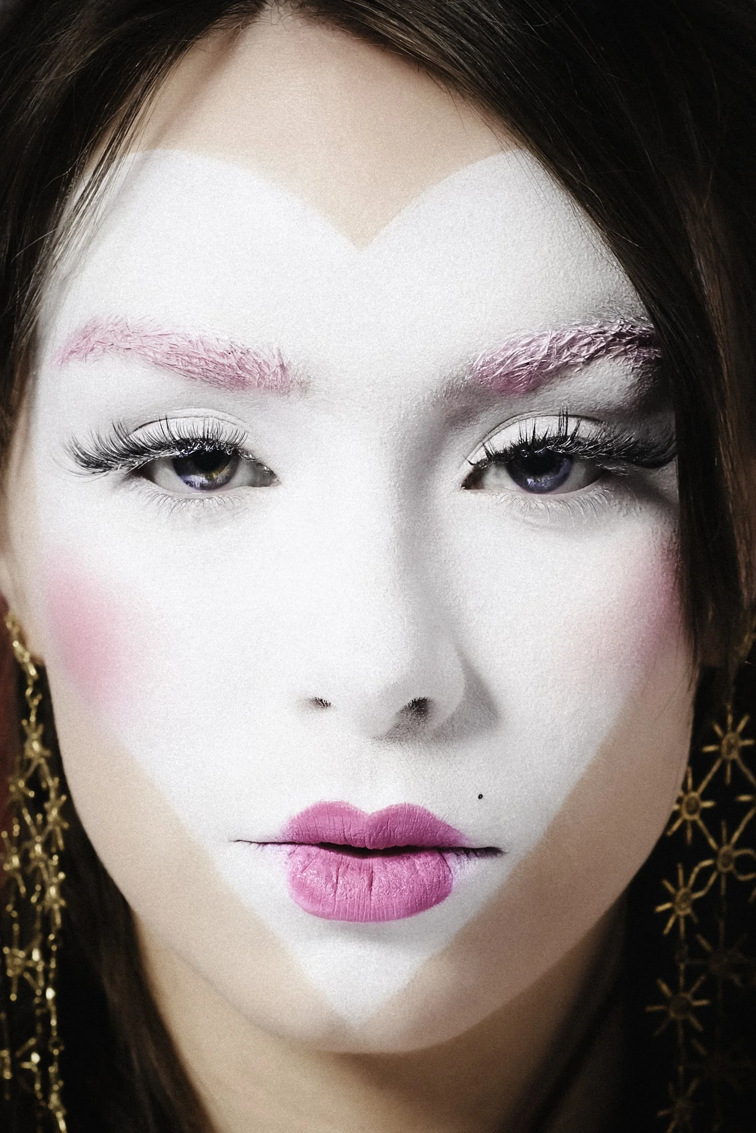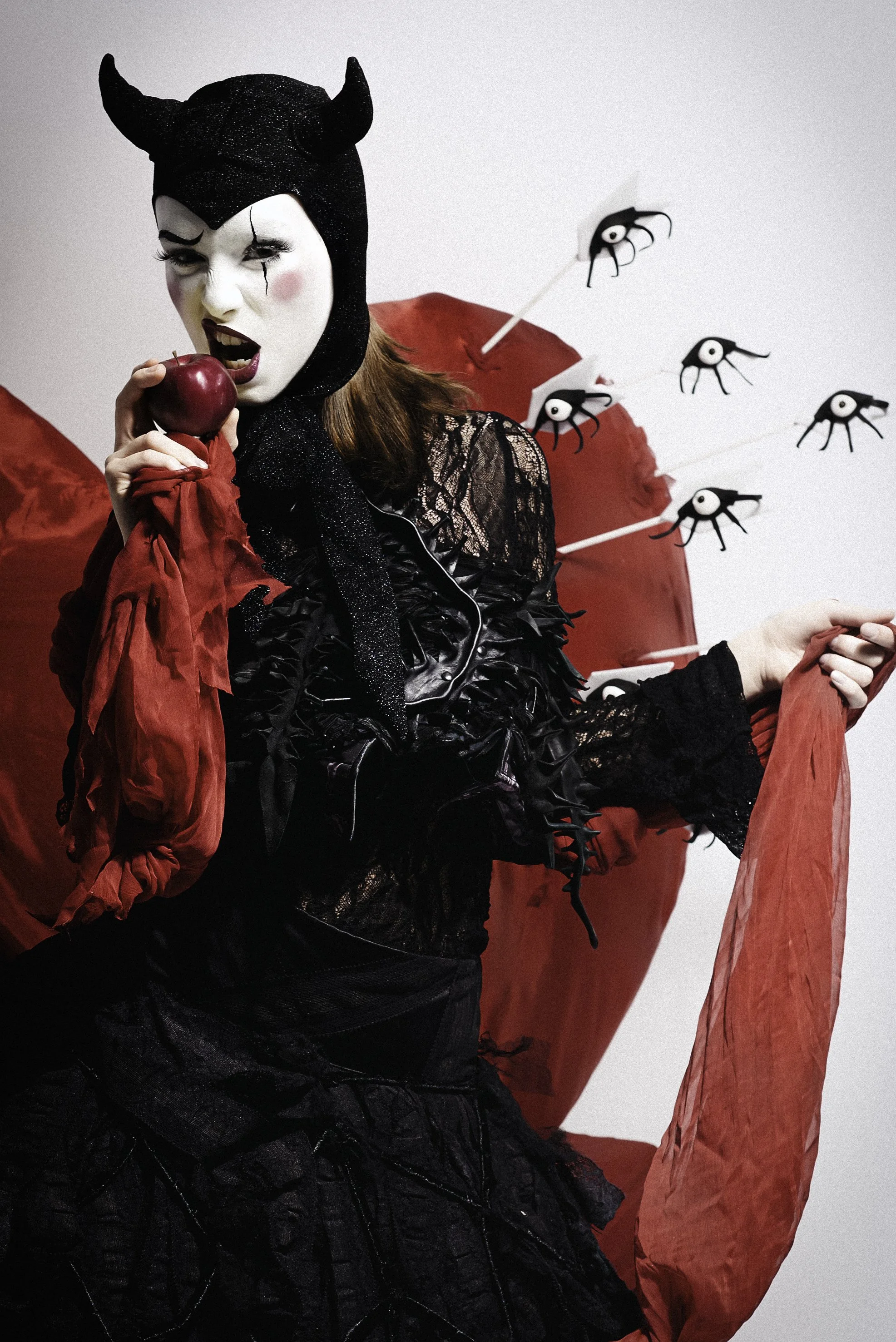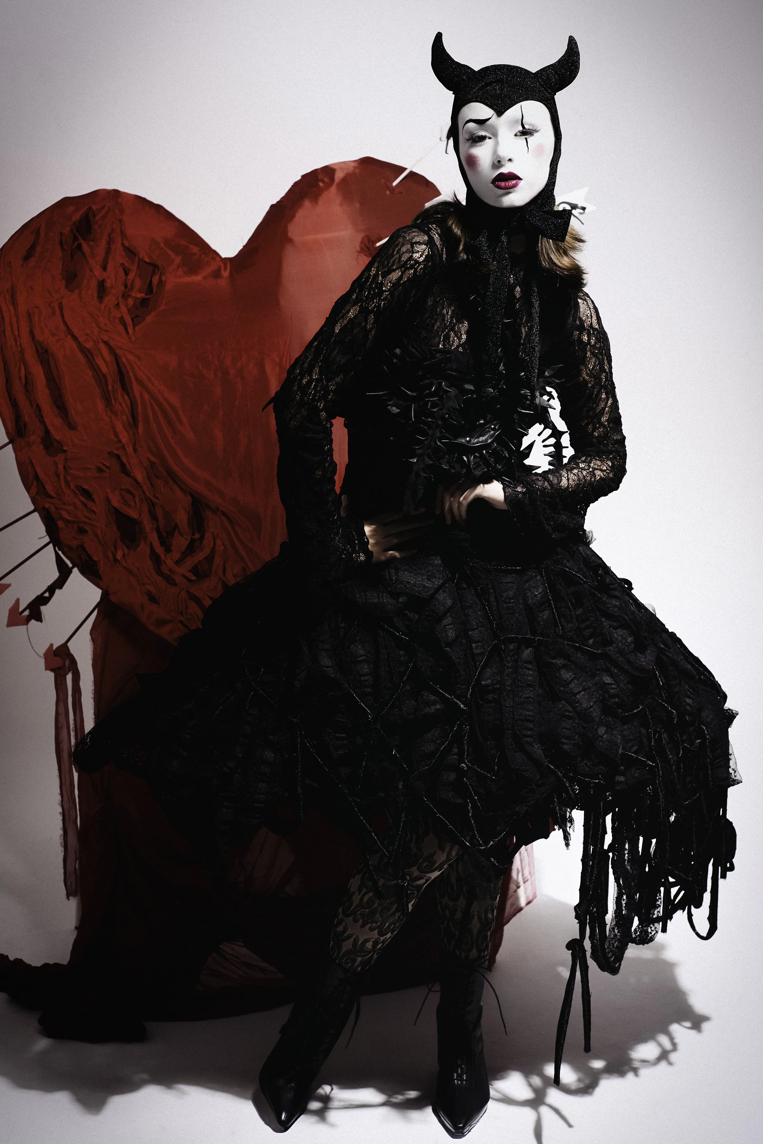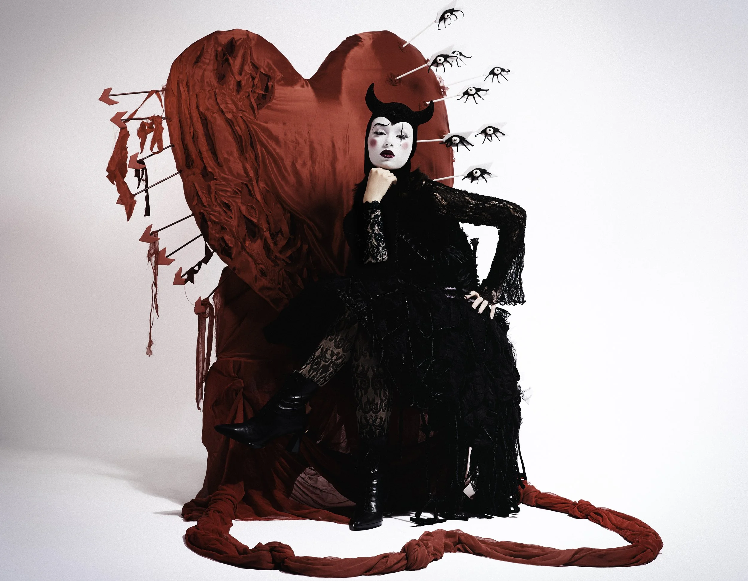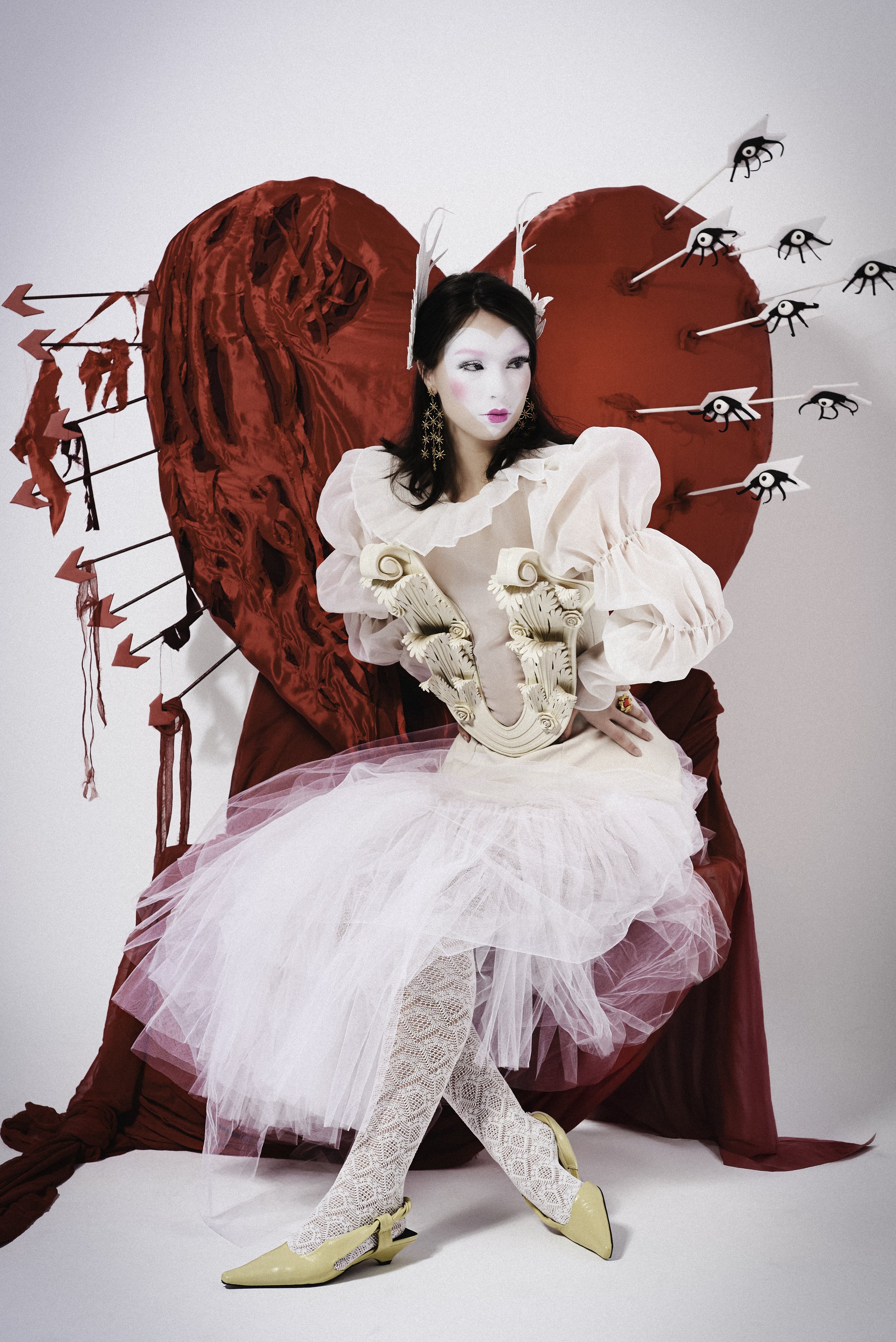 A single model embodies two opposing states (angel and devil) representing the emotional duality of romanticism, where innocence and manipulation coexist within the same body. The suspended heart functions as a stage prop and symbol of exposed love: fragile, controlled, and performative. It doesn't belong to any particular character but rather acts as the common axis of both states.