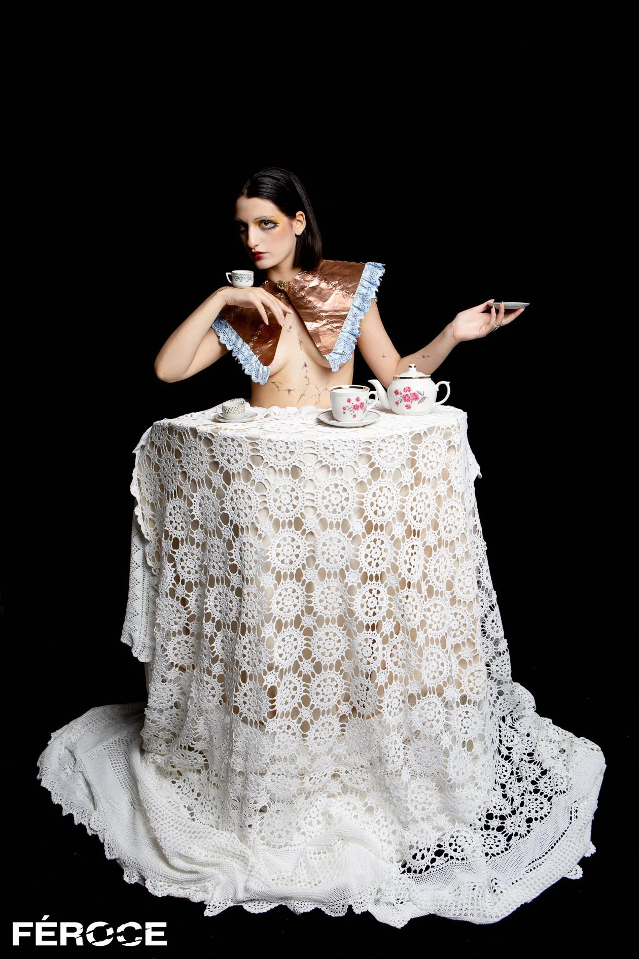 The Tea Table image brings the work into a domestic register, but without comfort. Lace, floral china and bare skin are arranged with a formality that removes any sense of nostalgia. The wearable shoulder piece by Maria Fokara interrupts the softness of the scene with sharp geometry, asserting the body as something structured rather than passive. The cracks painted across the skin establish a clear visual relationship between the figure and the surrounding objects, treating both as surfaces marked by use and stress.