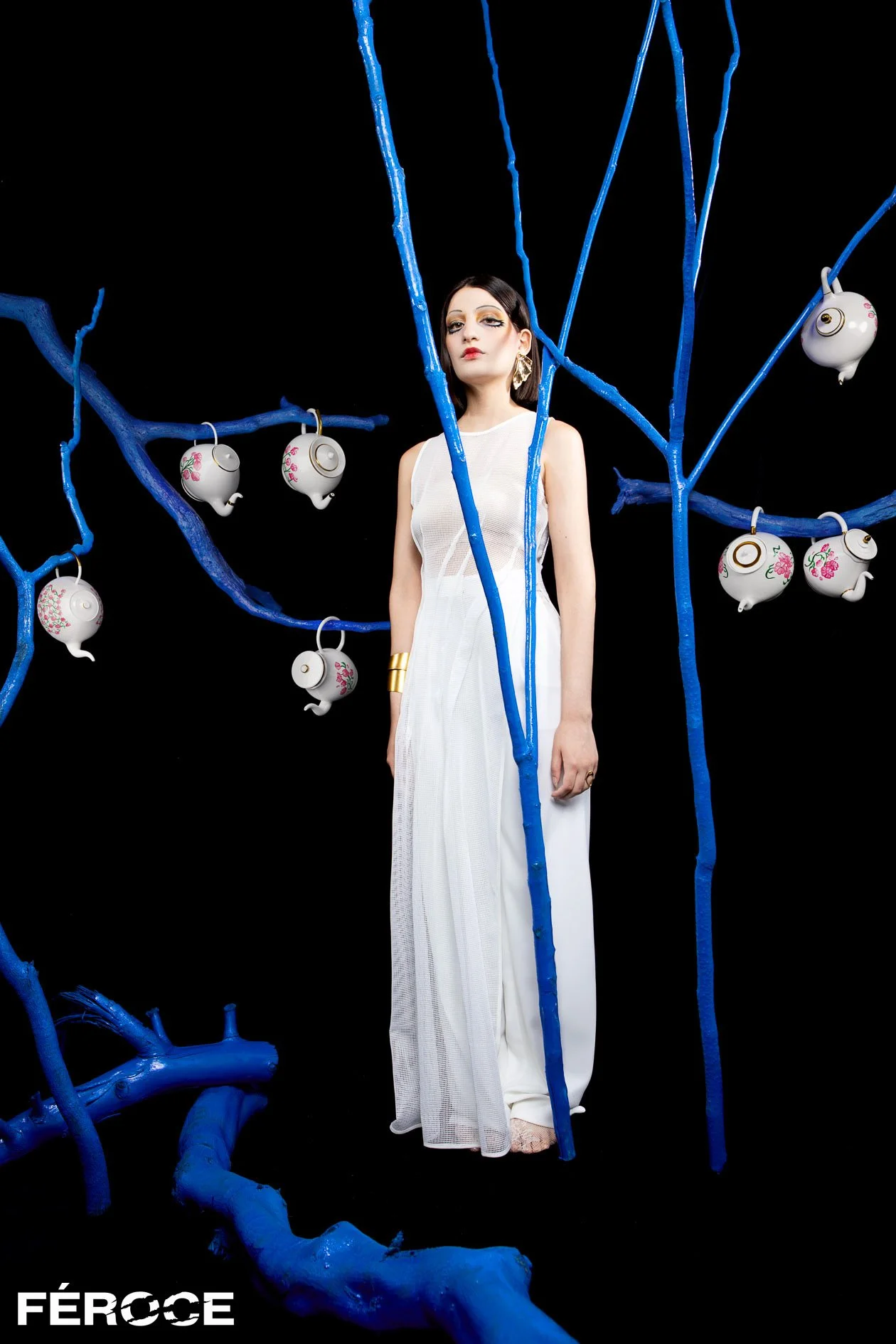 In the Blue Branches set, artificial cobalt forms create a rigid environment that feels engineered rather than natural. Teacups hang with an intentional awkwardness, resisting symmetry or ease. The maxi dress by Ioakeim Mitakos introduces a measured silhouette that anchors the figure within the set, allowing the environment to assert itself without visual confusion.