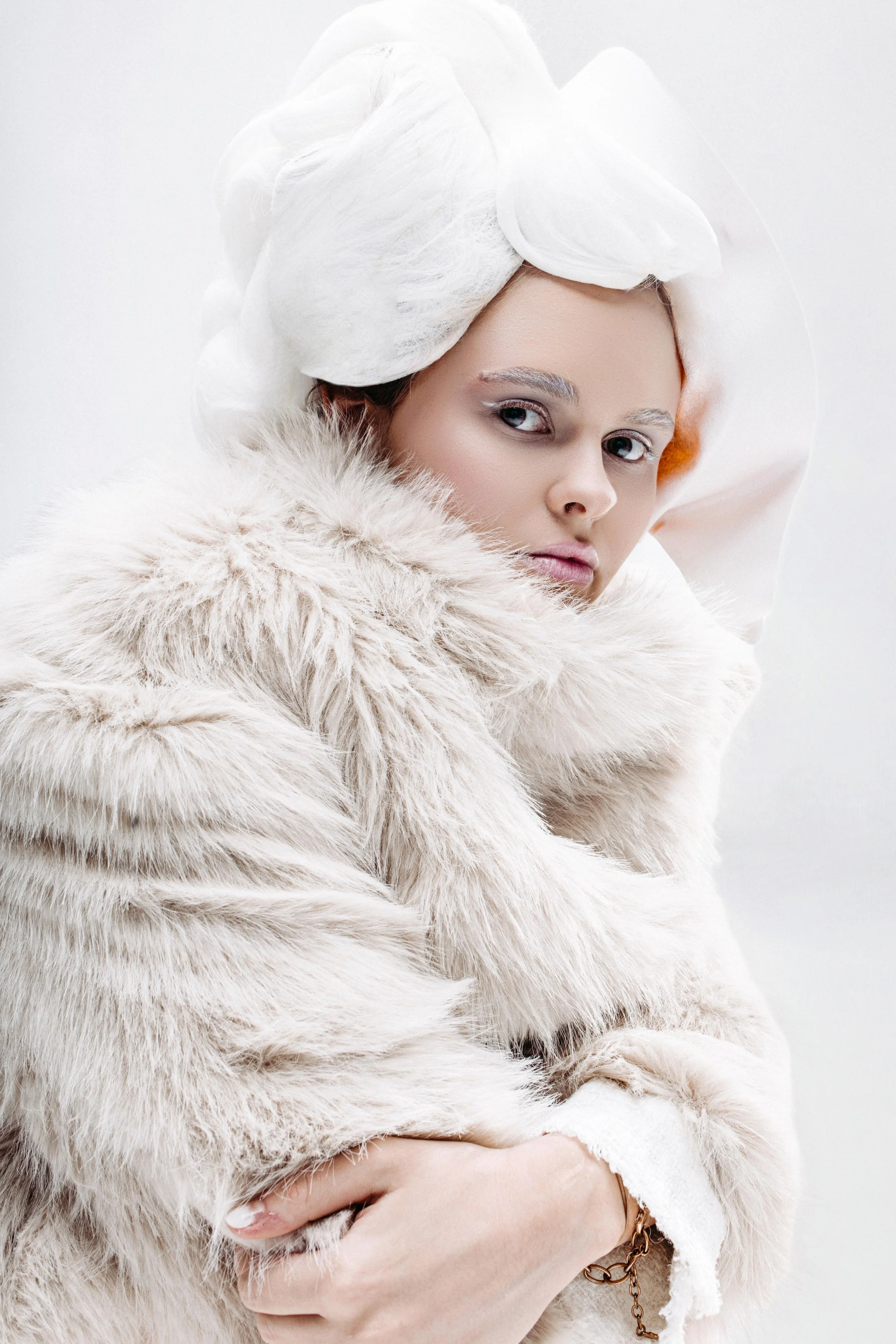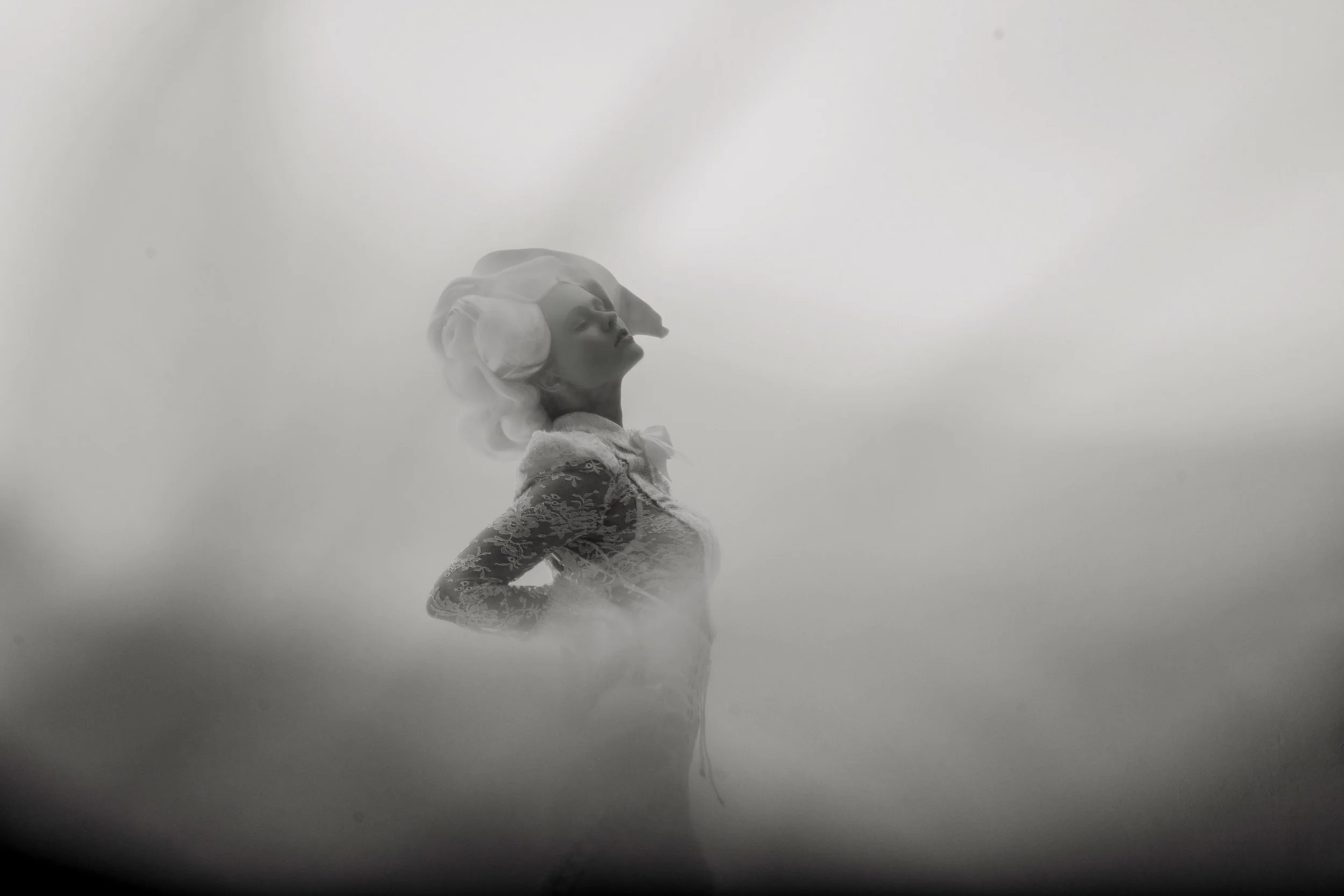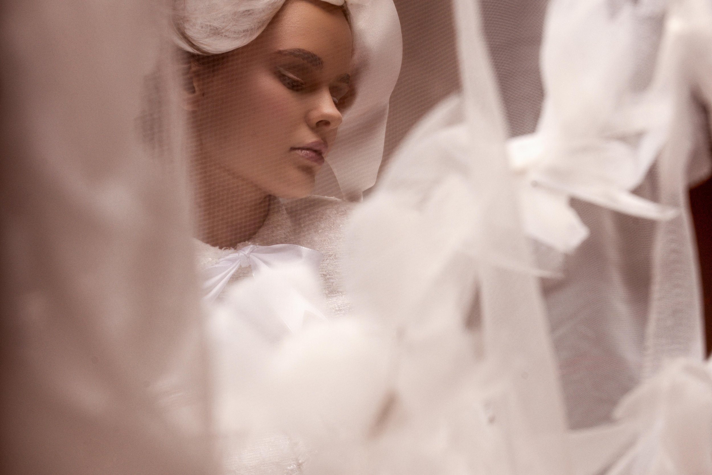 Layers of fabric and sculptural shapes transform the body into a delicate, almost abstract appearance suspended between fashion and stillness.
