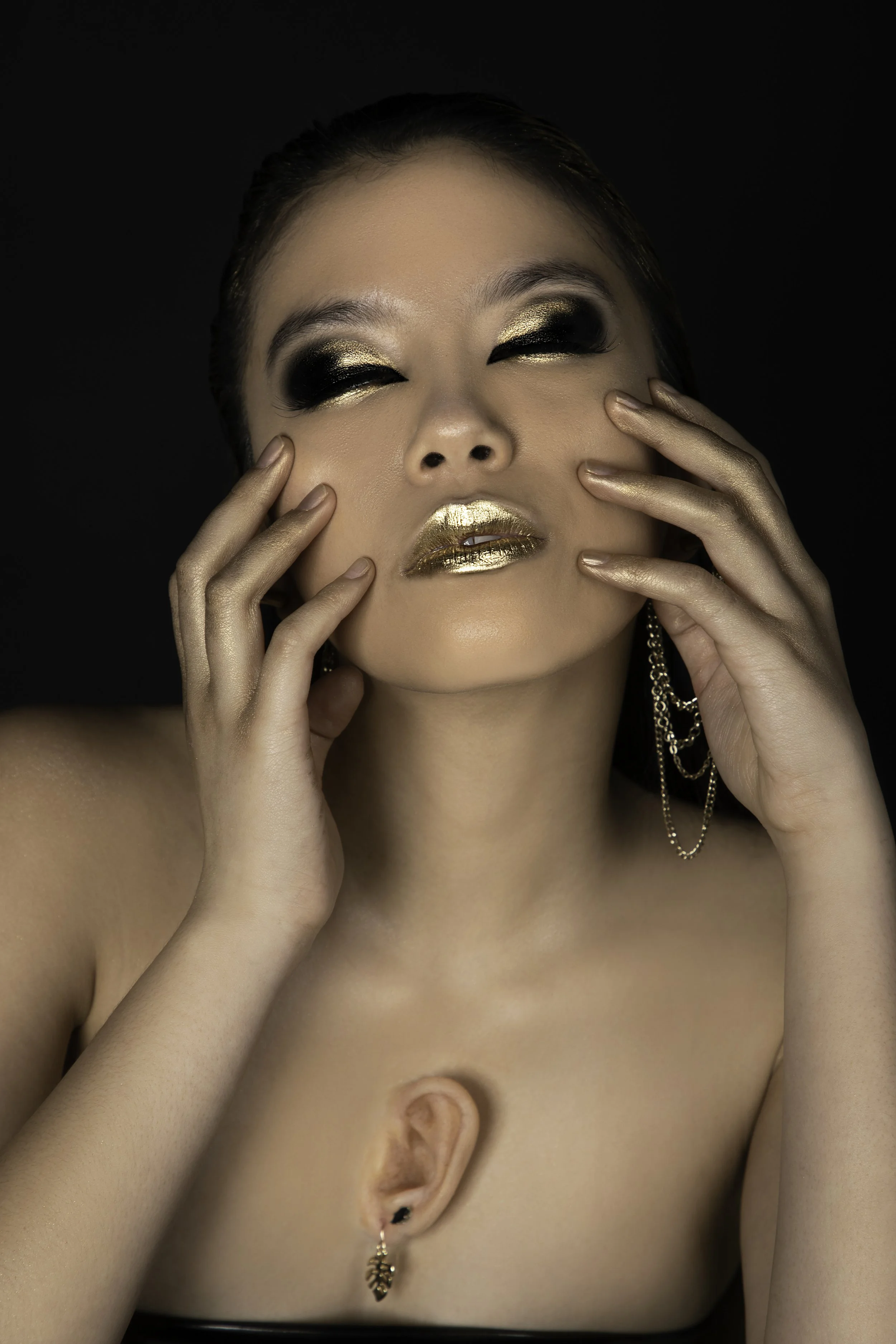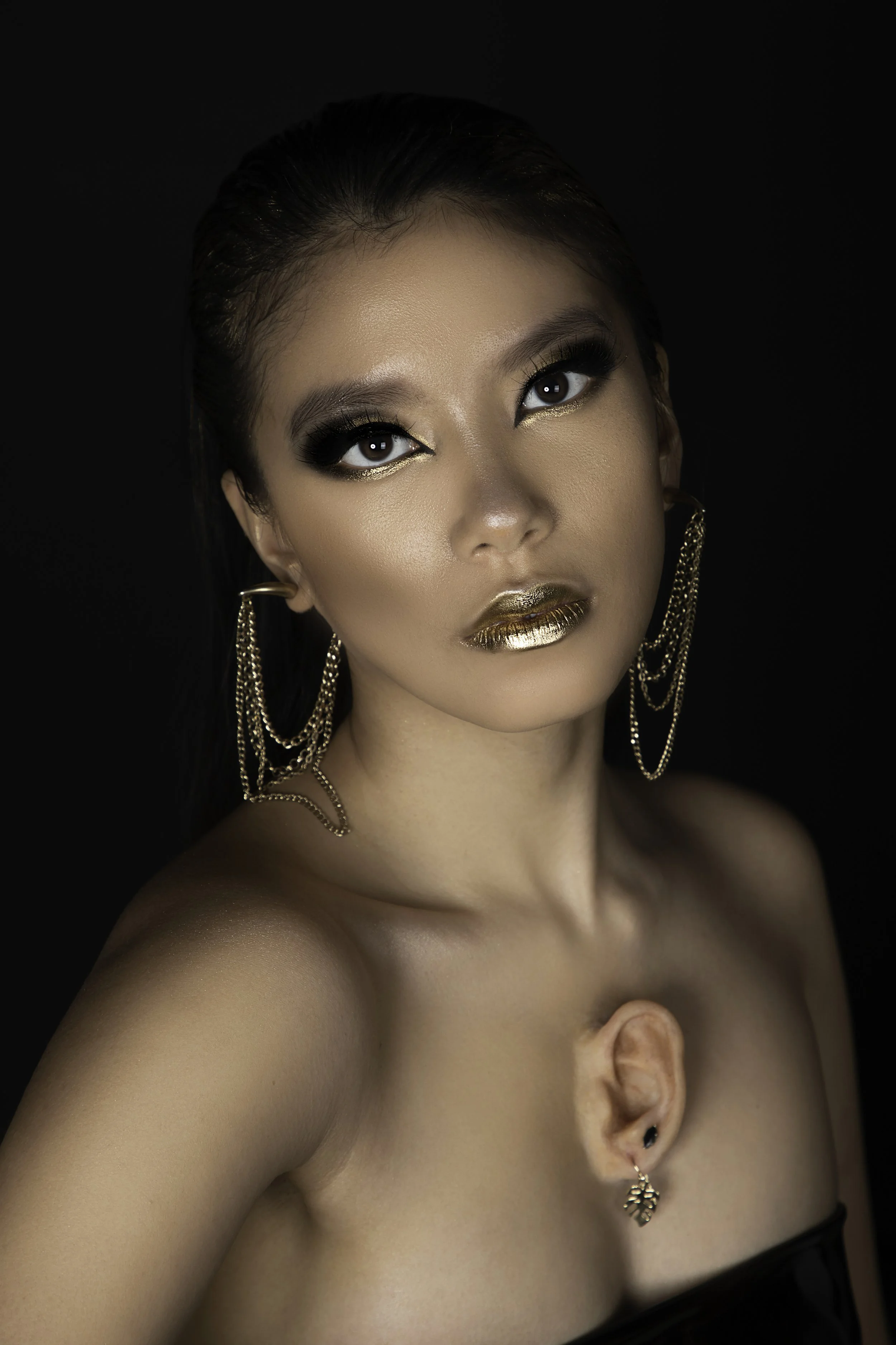 The second design illustrates the “outcome” of animal testing. It depicts the model as beautiful, with gold and black makeup applied in a glamorous way. However, on closer inspection, a prosthetic ear is growing on her chest.