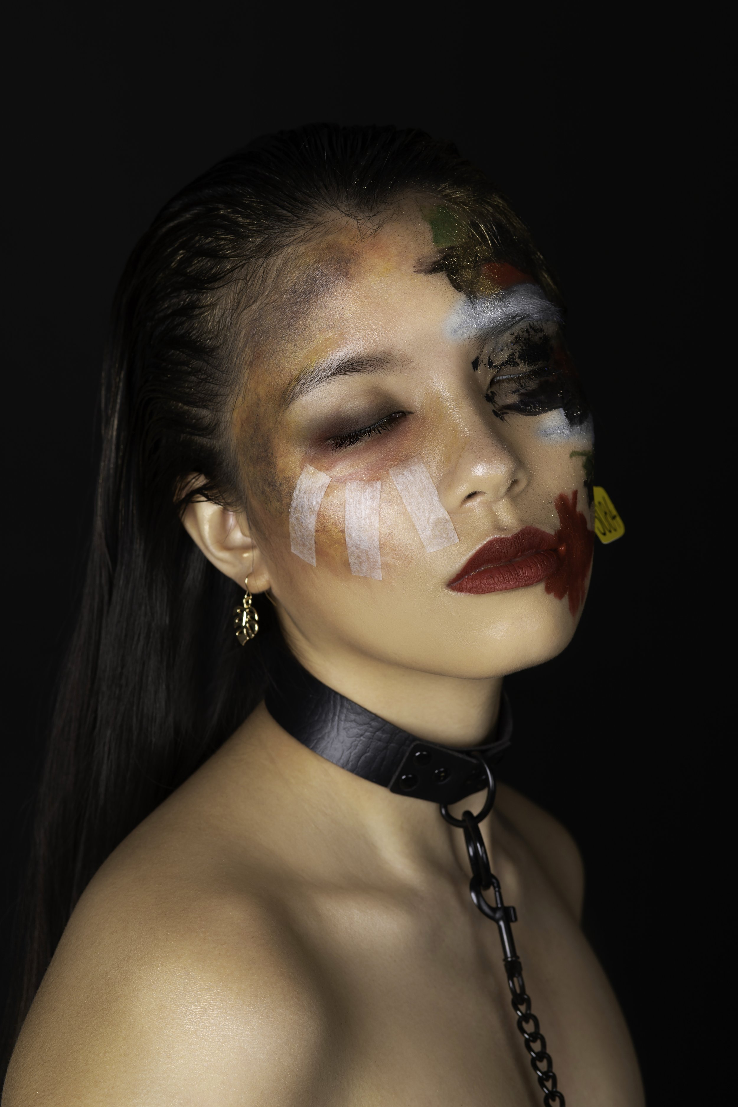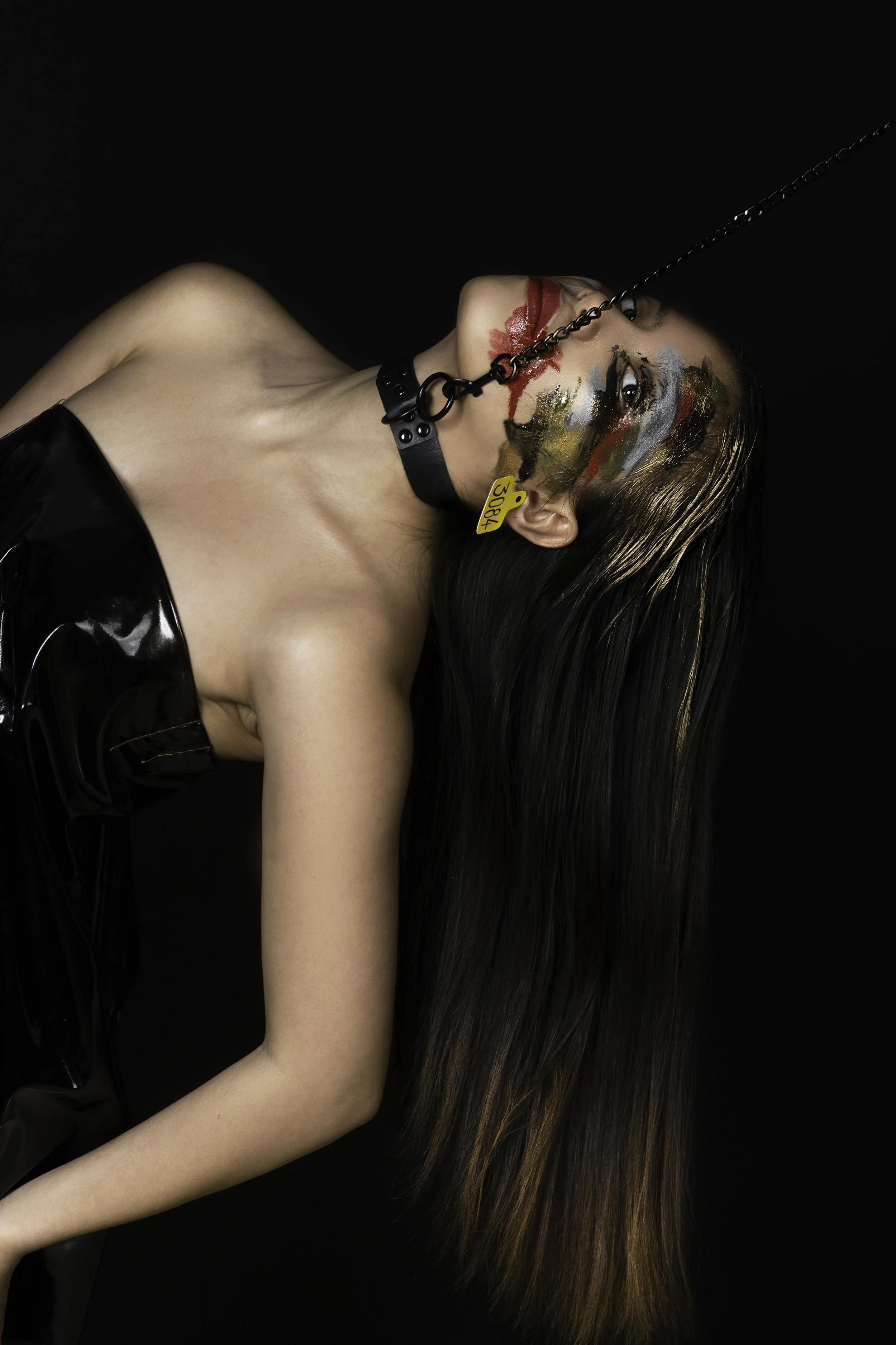 The first image in the series represents the “testing” aspect. It shows the model chained and beaten, with her eyes forced open and make-up swatches applied all over her, creating an uncomfortable and distressing scene.