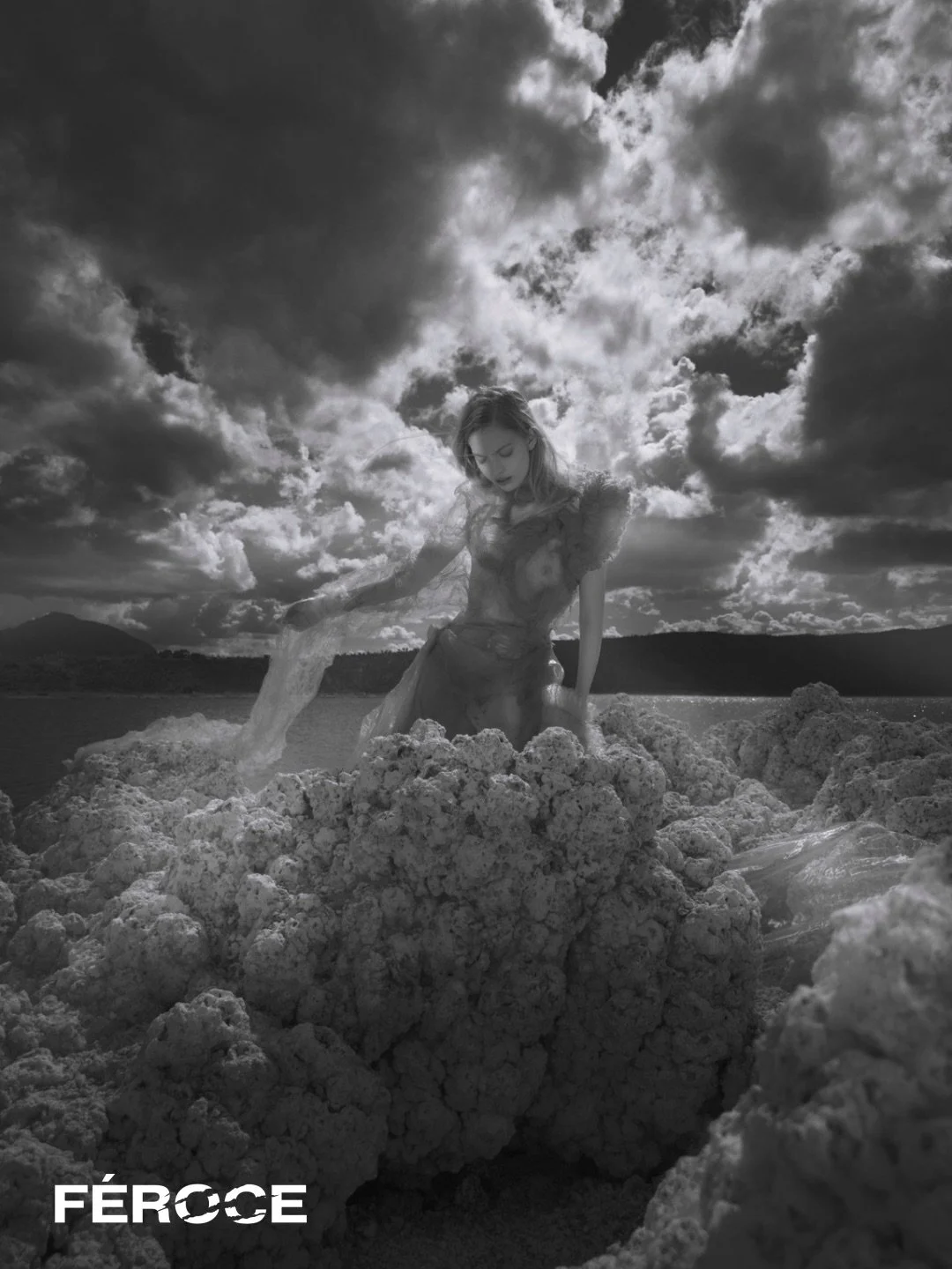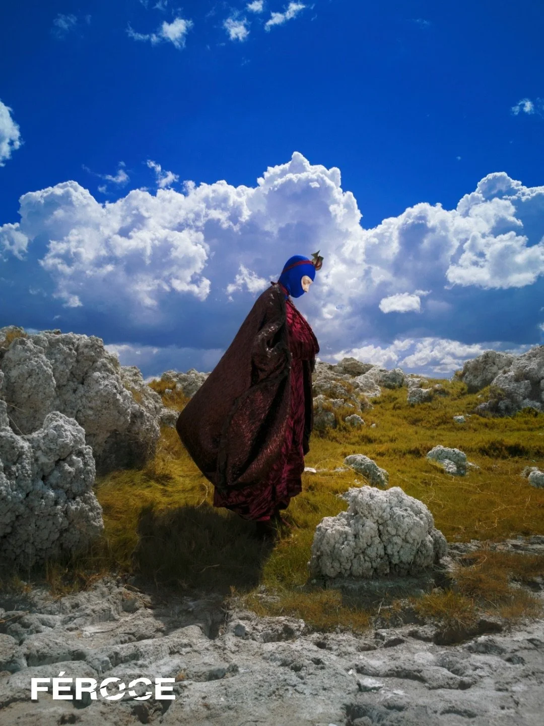 We wanted to create a Baroque representation of La BEAUTÉ GROTESQUE concept. Asymmetric clothes and accessories in a dramatic location, La Laguna de Alchichica, an extinct volcano between the states of Puebla and Veracruz, in Mexico, that is now a lake of salt water that leaks from the ground.