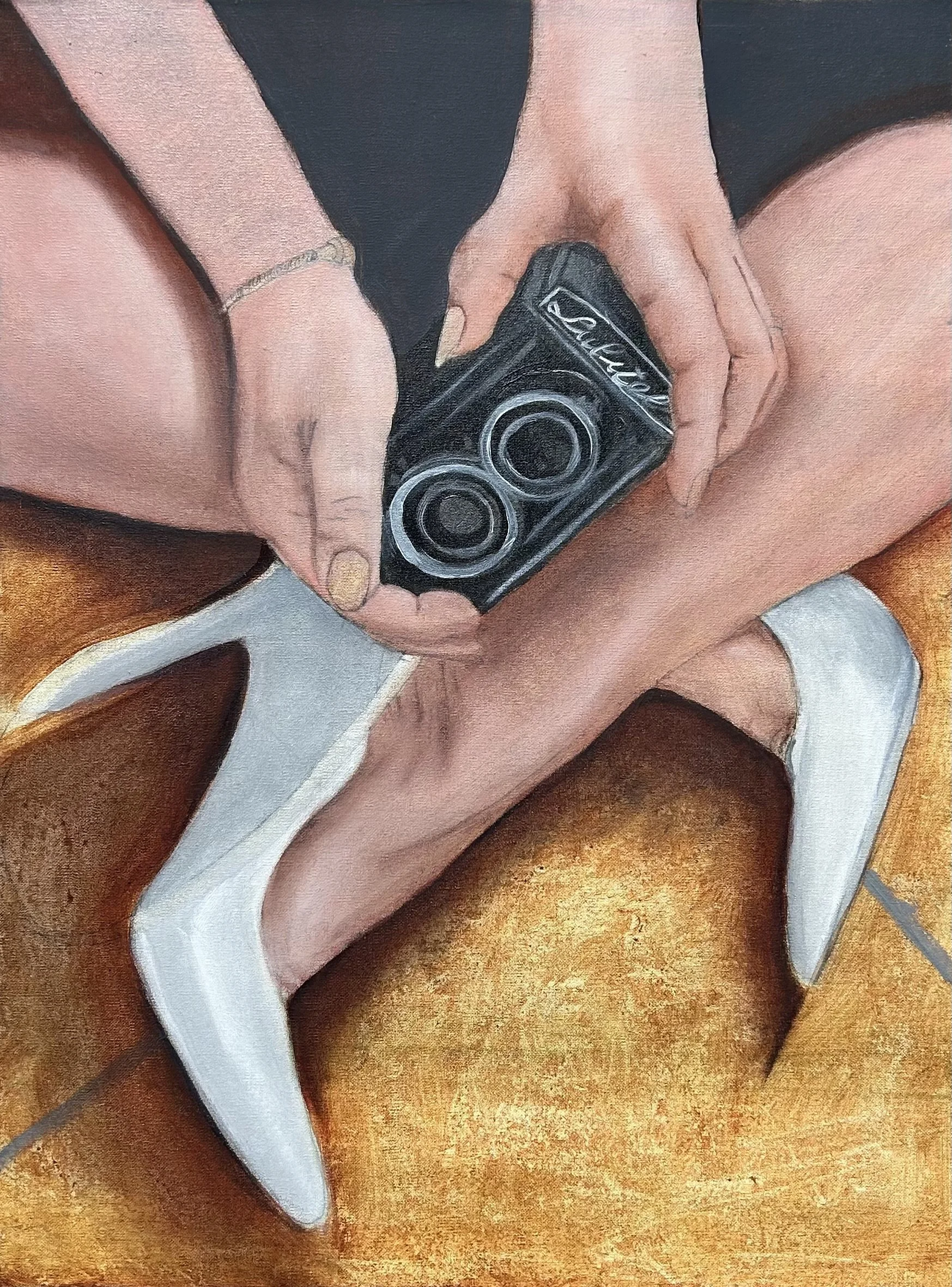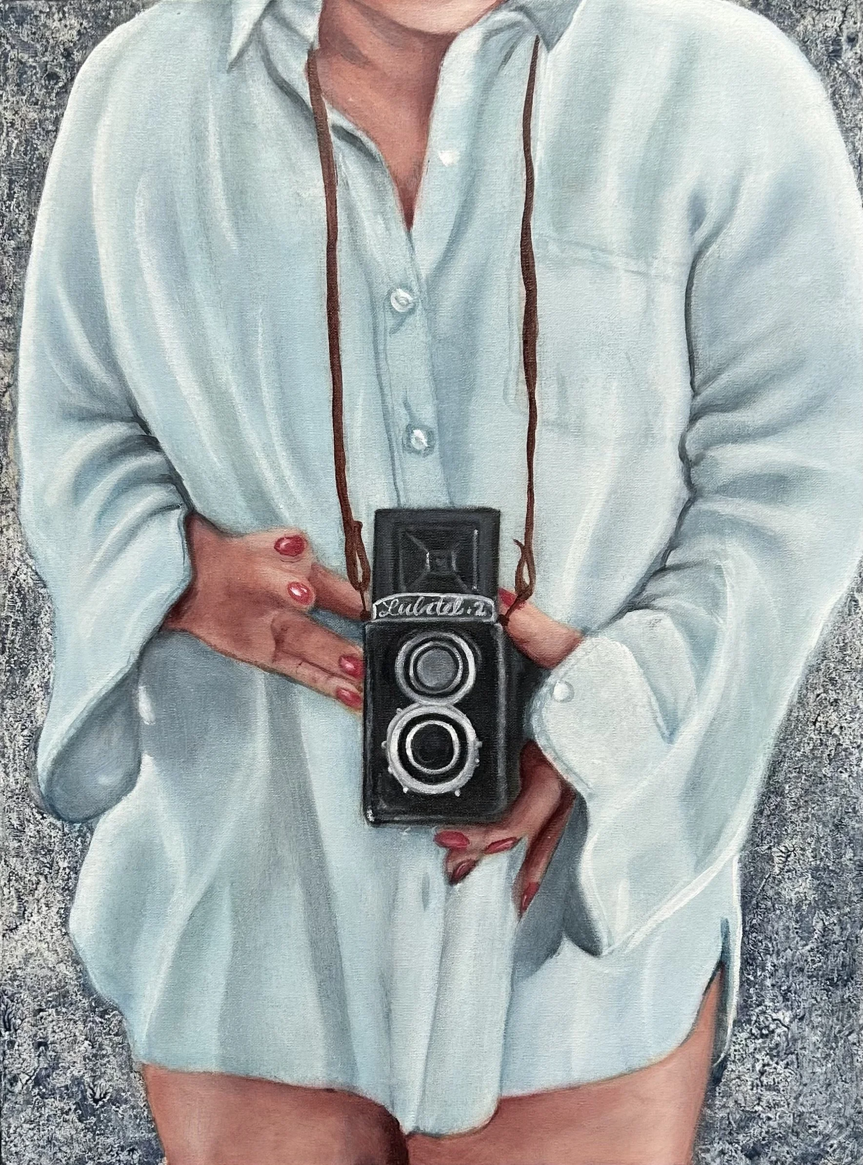 Philosophically, the camera ceases to be a mere tool for capture and transforms into a transitional object. As Maurice Merleau-Ponty suggested in his phenomenology of perception, the tool becomes an extension of the body. In Wild’s canvases, the Lubitel 2 is not simply held or placed; it seems to be grafted into the flesh, becoming the organ through which the filial bond is decoded and rendered eternal.