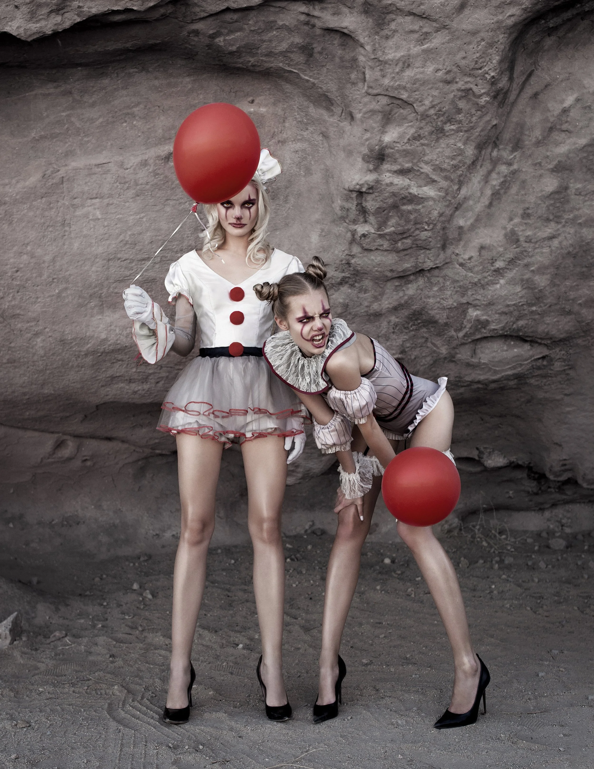 Hair and makeup play a defining role within the fashion photography series. Stylised makeup and sculptural hair designs amplify the theatrical qualities of the imagery while maintaining consistency across the set. A clear influence from Stephen King’s IT is portrayed throughout the project. Costume selections support the concept through strong silhouettes and contrasting textures, reinforcing the symbolic divide between softness and power without tipping into excess.