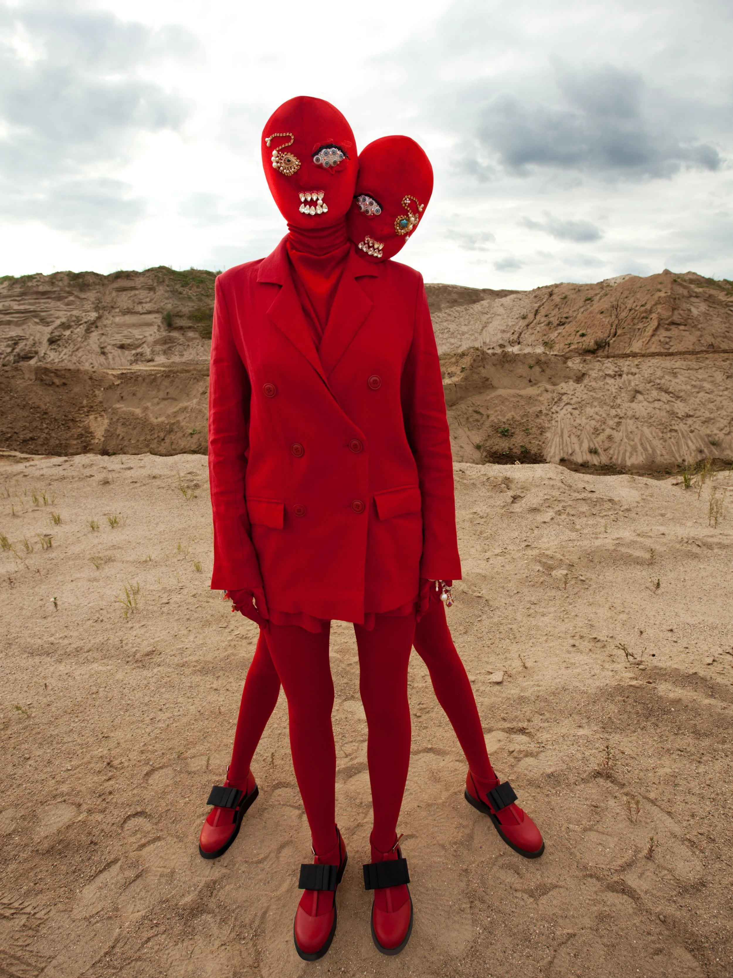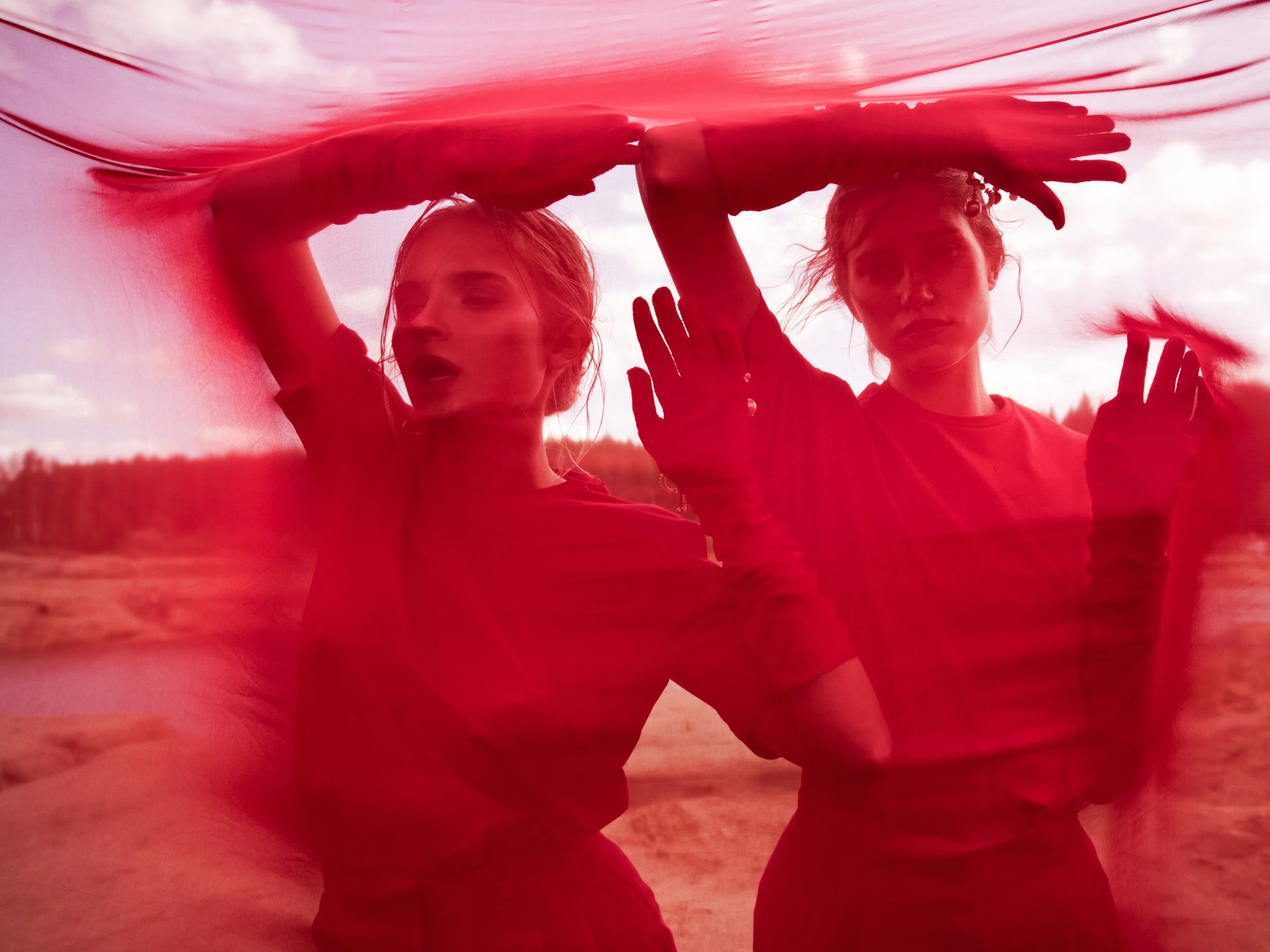 This conceptual fashion photography editorial examines tension, movement, and identity through expressive imagery, styling, and a focused visual narrative. The fashion editorial uses saturated red as a central visual and symbolic device, creating a sense of urgency and emotional compression across expansive desert landscapes and stark studio backdrops. Plumes of coloured smoke cut through the open environment, introducing contrast and disruption against the stillness of the desert terrain.