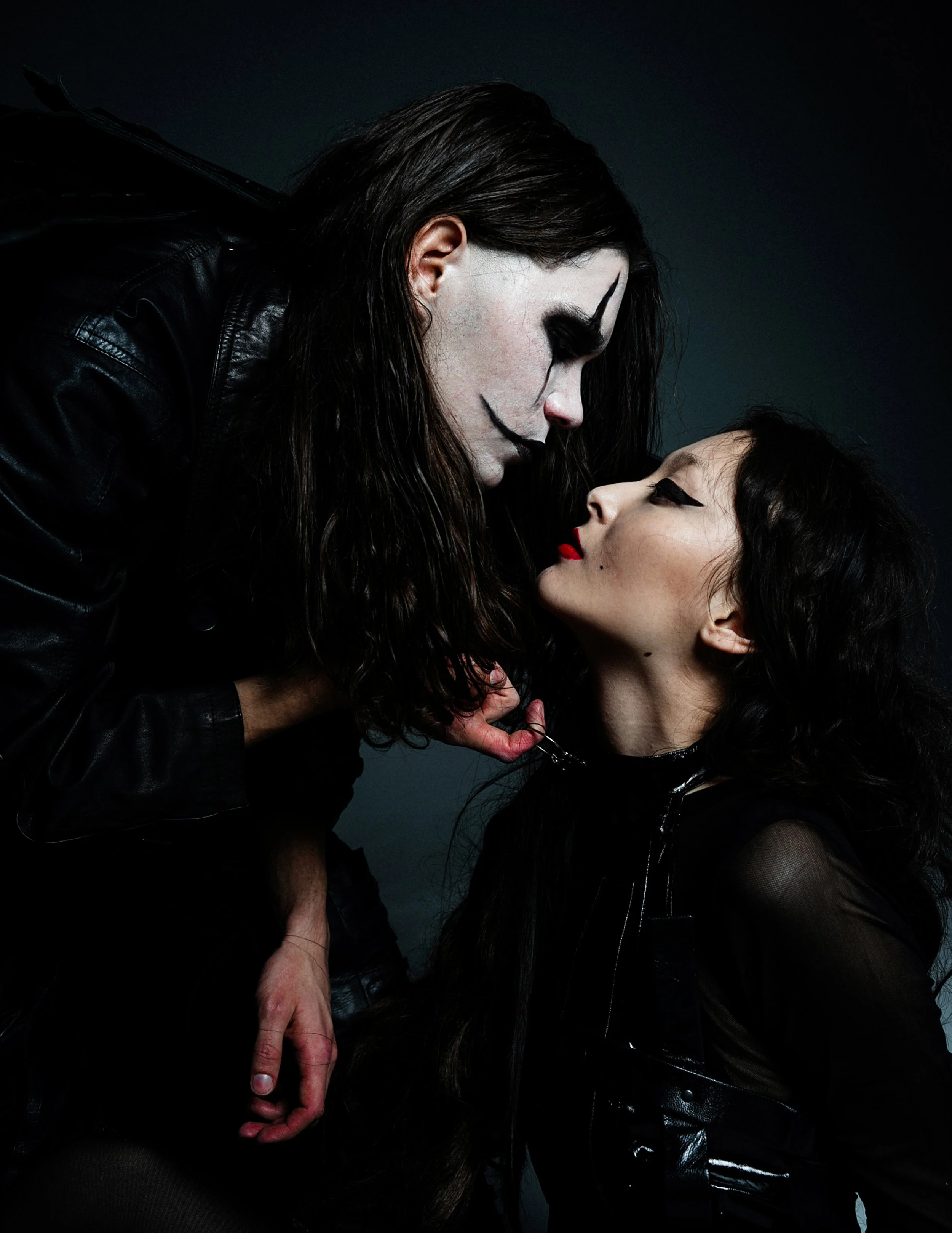 Makeup by Alena Serbina plays a central role in shaping character and mood. The graphic eye work and pale base amplify the dramatic contrast within the images without overpowering the styling or performance. The models, Asel Habibi and Yegor Gavrin, deliver controlled, physically expressive performances that reinforce the project’s themes of dominance, vulnerability and transformation. Gavrin’s presence as both musician and model adds an additional layer of narrative depth.
